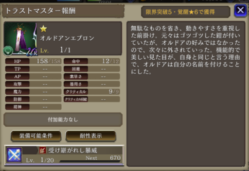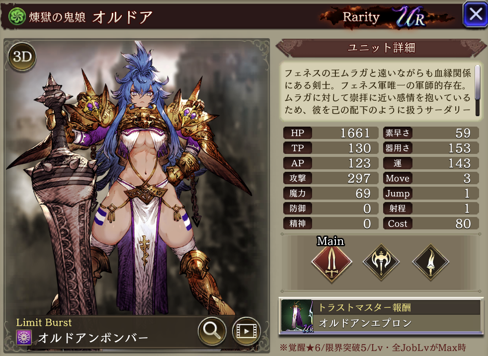 | ⇩MA3強化⇩ 味方の風属性ユニットのHP上限+10%・風属性アビリティ攻撃+15 自身の獲得AP’+30%、HP上限+50%、斬・刺・打・射撃耐性+15 |