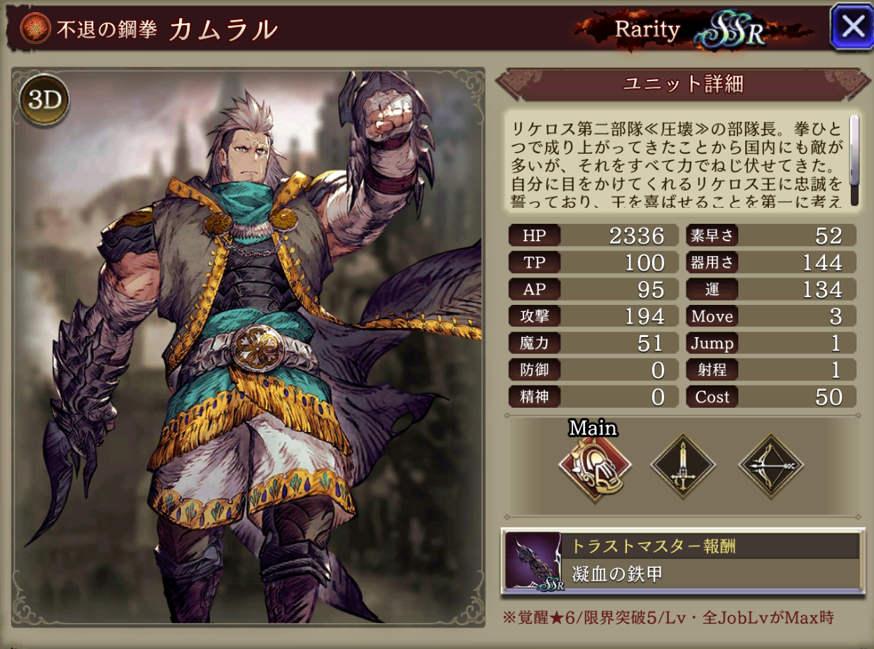 | 味方の火属性ユニットのHP上限+10%・麻痺耐性+25、自身の打撃耐性貫通率+10、リアクション阻止率+20、氷属性キラー20 |