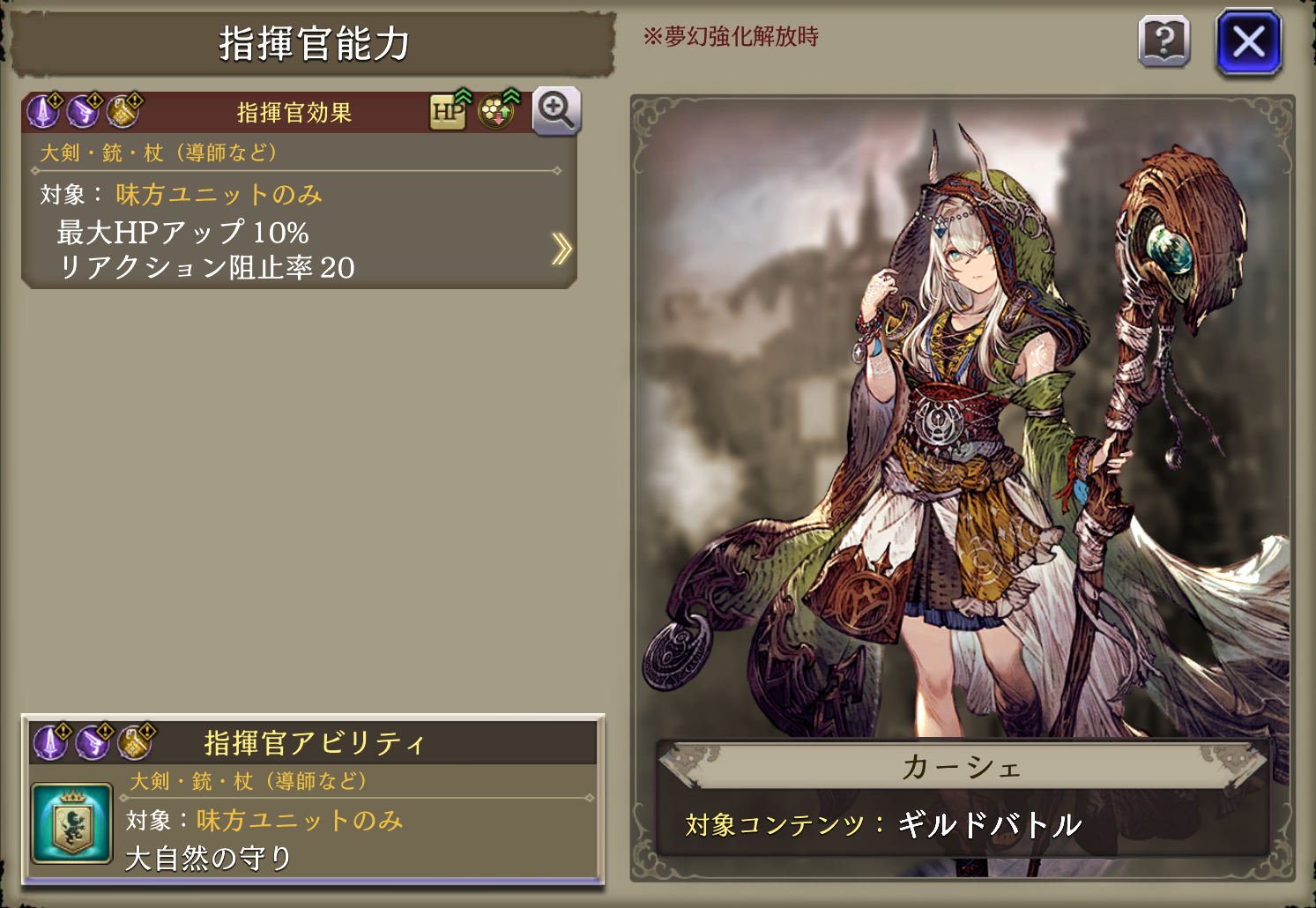 草木の声 ↓ 大自然の呼び声(EX) | 魔力+24%、治癒力+20、攻撃範囲が広い程物魔被ダメ軽減15、バトル開始から1ターン素早さ+25% ↓EX強化 魔力+24%、治癒力+20、攻撃範囲が広い程物魔被ダメ軽減15、バトル開始から1ターン素早さ+25%、自身以外の味方が戦闘不能時CT+30 |
