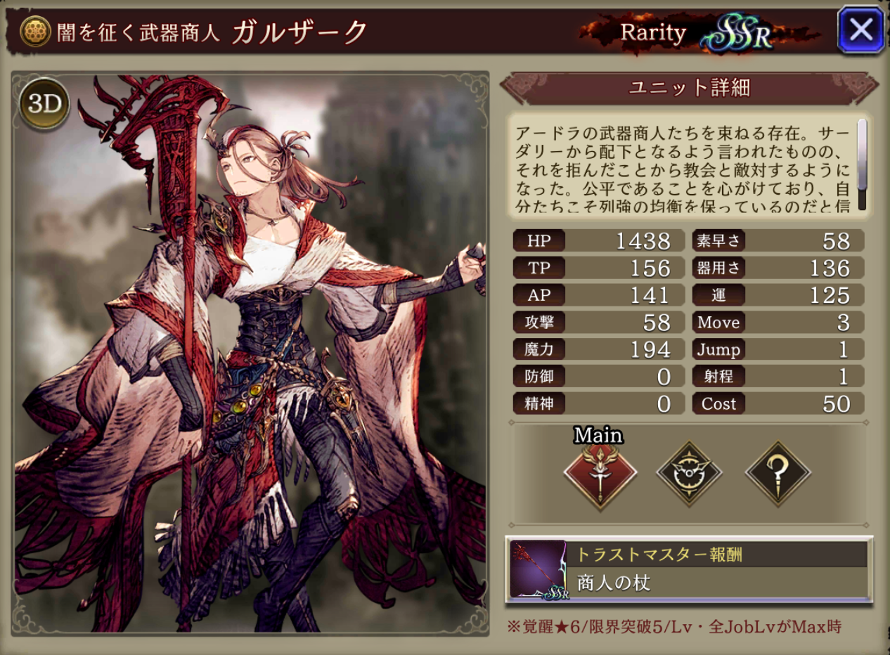 | <MA3> 味方の土属性ユニットのHP上限+10%・混乱耐性+25 自身の精神貫通率+10、範囲耐性+15、魔力+20%、遠くなる程物魔被ダメ軽減10(4~7マス)・呪い耐性50 |