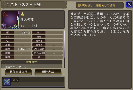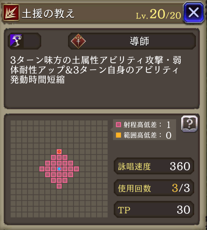 ![]() | 土属性アビ+30 弱体耐性+30 アビリティ短縮300 | 18 | |