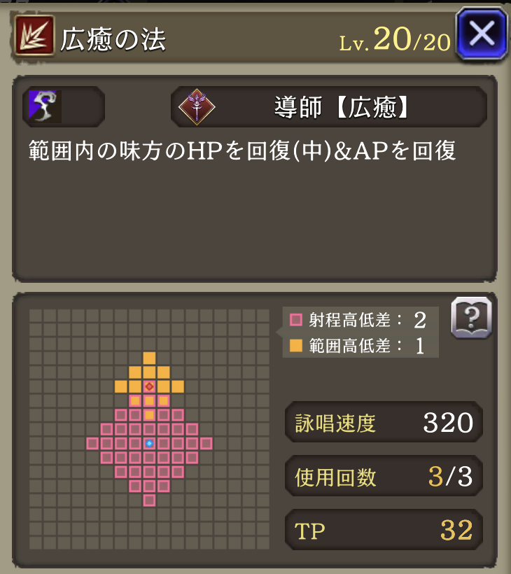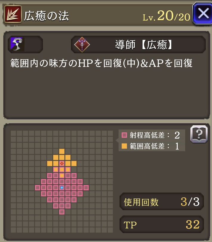 | 「広癒の法」 使用回数+1&距離遠くなる程回復量増(2~6マス) |