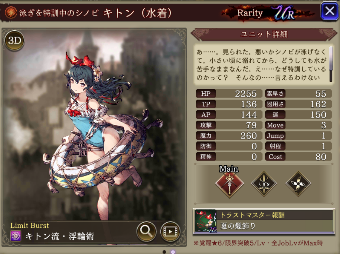 | ⇩MA3強化⇩ 味方の火属性ユニットのHP上限+10%・火属性アビリティ攻撃+15 自身の精神+5、単体攻撃耐性+10、範囲耐性+15、クリティカル回避10、攻撃アビリティ発動時間短縮-20%、LB強化(3ターン対象の精神25ダウン後ダメージに) |