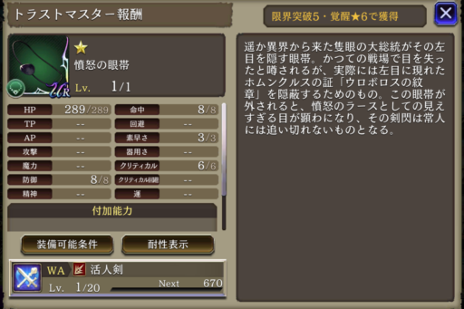 | Lv50+6 | 攻撃+25% キング・ブラッドレイ限定: 斬撃攻撃+15、斬撃攻撃貫通率+20、範囲耐性貫通+10、HP20%以下でCTアップ(小) |