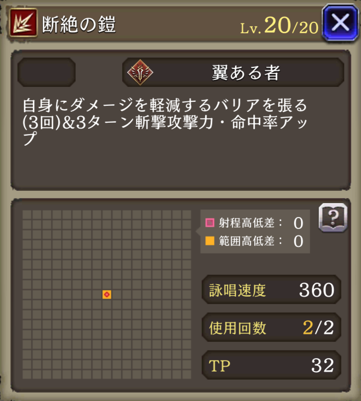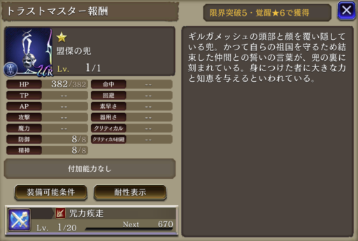 HP+1250、命中率+15、斬撃攻撃力+10、素早さ+10%、断絶の鎧に3ターン斬撃+20、命中+30効果追加