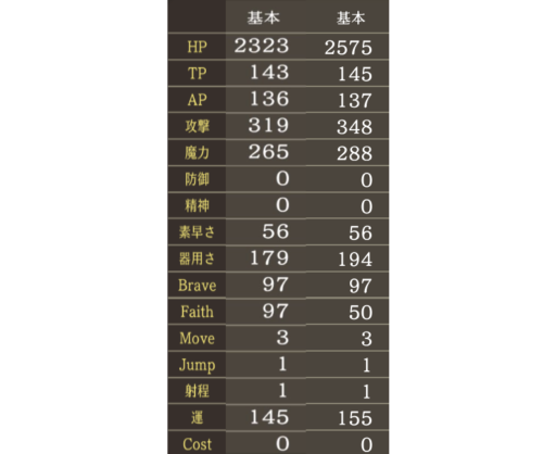 ※全てアビリティLV.MAX、Brave/Faith値MAXの値