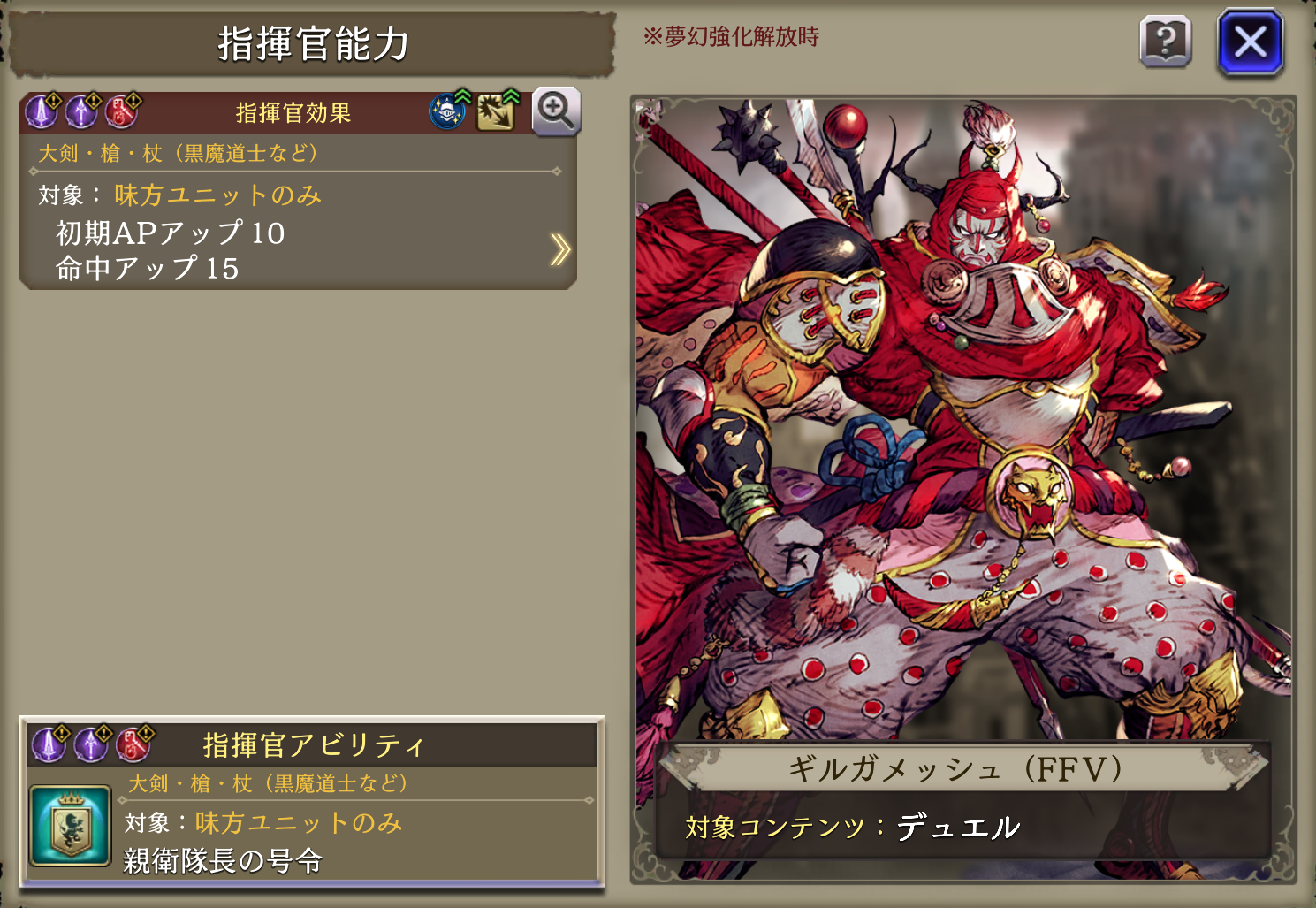 | 味方の火属性ユニットのHP上限+10%・火属性アビリティ攻撃+15、自身の範囲耐性+15・クリティカル回避率+20 |