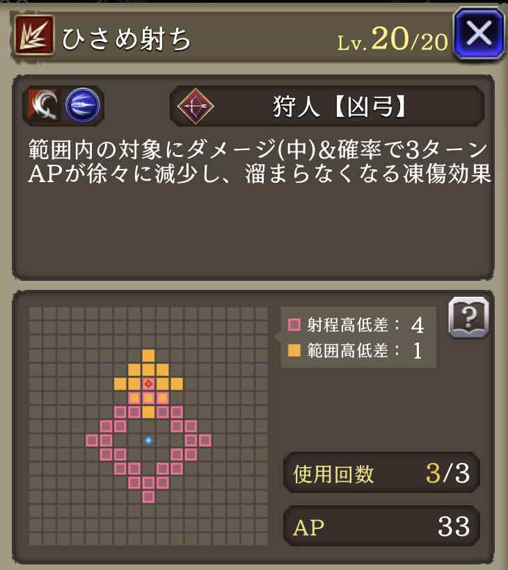 | JobLv19 さみだれ射ち強化 | 消費AP7ダウン(38に)、凍傷効果(APは回復不可になり、毎ターンAP10%ダウン)追加 |