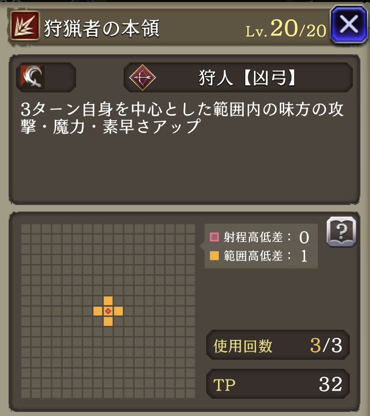 | JobLv25 狩猟者の本領習得 | 3ターン自身を中心とした範囲内の味方の攻撃・魔力+30%、素早さ+25% |