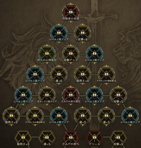 狩人の心得 ↓ 凶弓の極意(EX) | 射程+1&命中+25 ↓ 射程+1&命中+25、AP獲得量+50% |