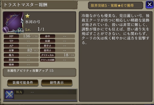 ![]() | 攻撃+42% クリティカル率+25 リアクション阻止率100 | 6 |