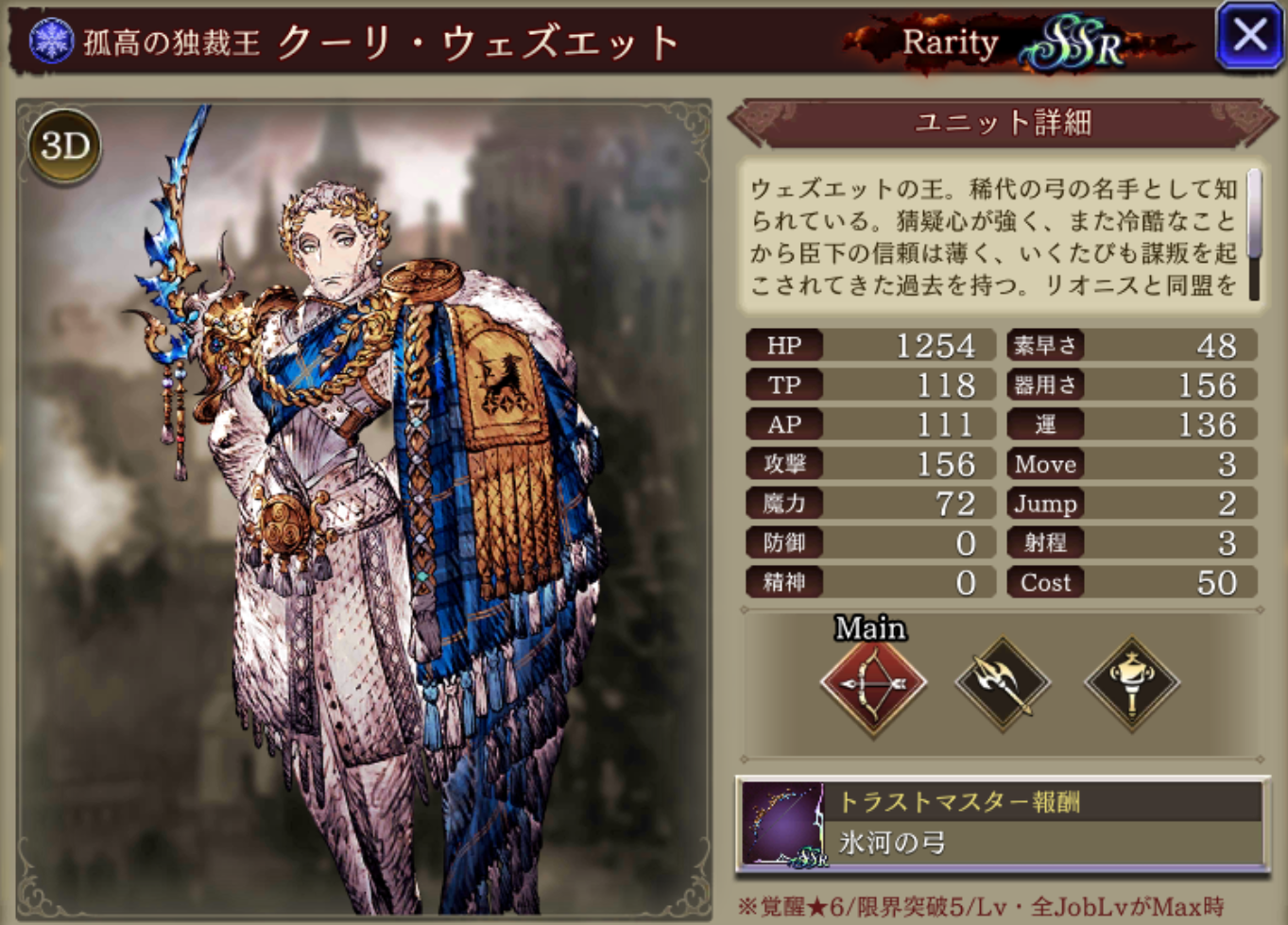 | 味方の氷属性ユニットのHP上限+10%・魅了耐性+25、 自身の射程+2、凍傷発動率アップ、HP上限+15%、AP獲得補正+30%、初期AP+10、攻撃+20% |