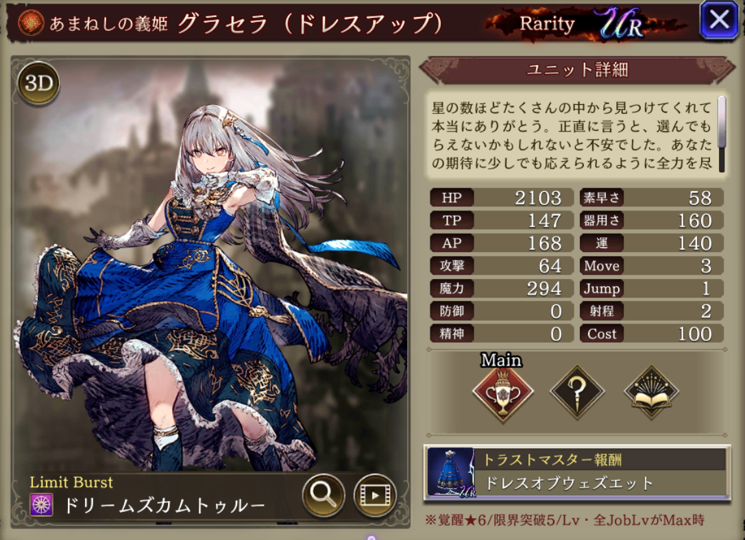 | ⇩MA3強化⇩ 味方の火属性ユニットのHP上限+10%・火属性アビリティ攻撃+15 自身のアビリティ発動時間短縮 -25%、範囲攻撃耐性+20、魔力+20%、魔法ダメージ+15%、疵裂きを強化(魔法バリアを破壊追加) |