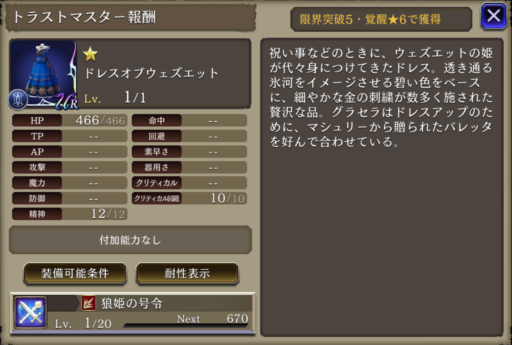 ![]() 英雄たちの邂逅 | P 魔力+50% P 命中+13 命中+23 斬撃耐性+20 |