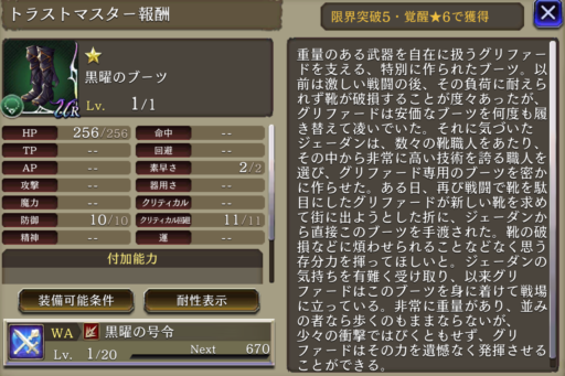 自身のHP+20%・防御+10・斬撃攻撃耐性貫通率+20・獲得AP+30%・被ダメージ時にHPが50%以下になるとHPの一定割合を回復(中)(2回