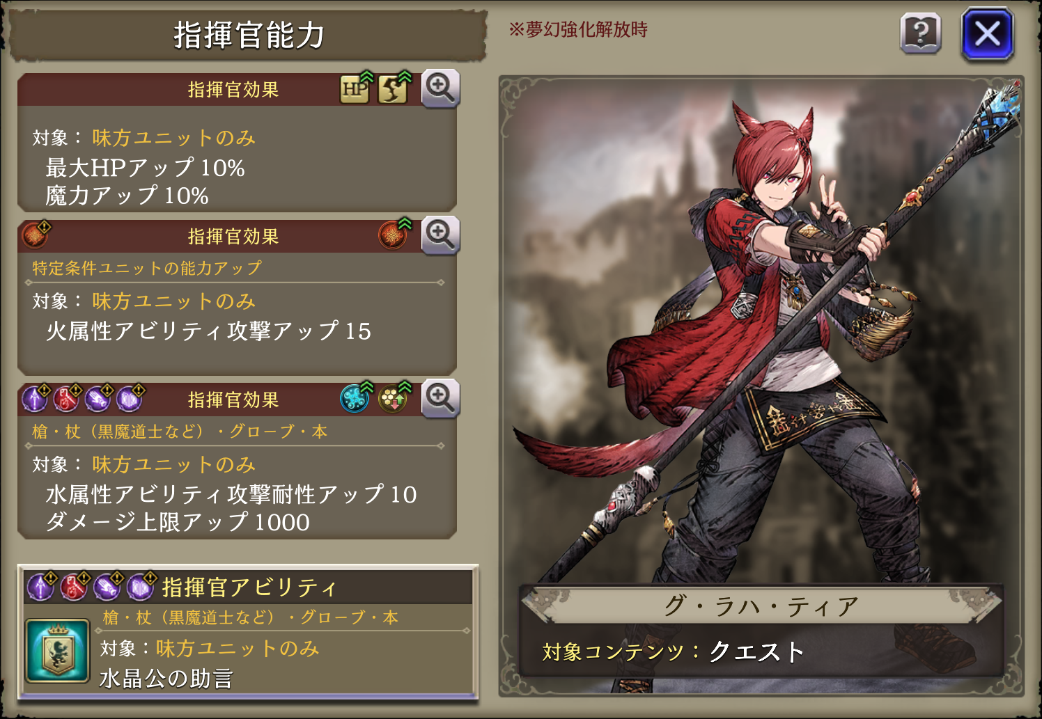 | ・味方の火属性ユニットのHP上限+10%・火属性アビリティ攻撃+15 ・自身の精神貫通+40・アビリティ発動時間短縮250 |
