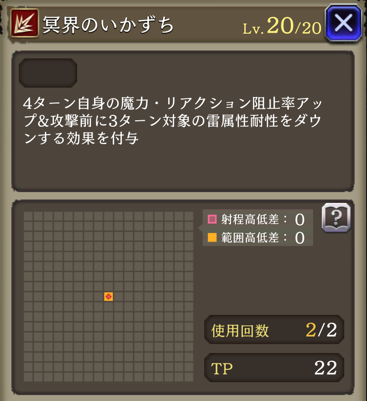 ![]() 4ターン自身の魔力+40%・リアクション阻止率+50、攻撃前3ターン雷耐性15ダウン | 541 |