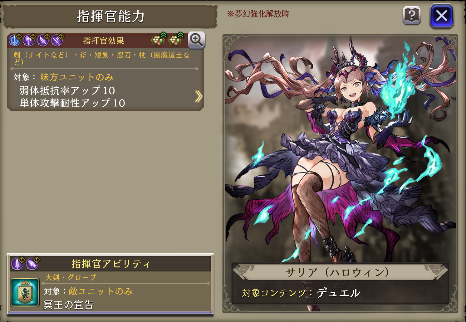 鎌持つ天使 ↓ 荒れ狂う冥王 | 魔力+24%、斬撃貫通+40、単体耐性+12 ↓ 魔力+24%、斬撃貫通+40、範囲貫通+40、単体耐性+12、遠い程被ダメージ軽減4~16(2~5マス)、敵が戦闘不能時CT+30、魔法ダメージ上昇20%、味方が戦闘不能時HP割合回復 |