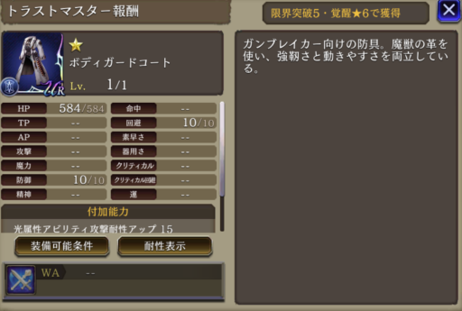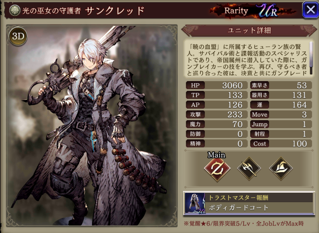 | 味方の光属性ユニットのHP上限+10%・光属性アビリティ攻撃+15、自身のHP上限+20%、斬攻撃力+10、攻撃+150、「ブラスティングゾーン」をバトル中詠唱無しに |