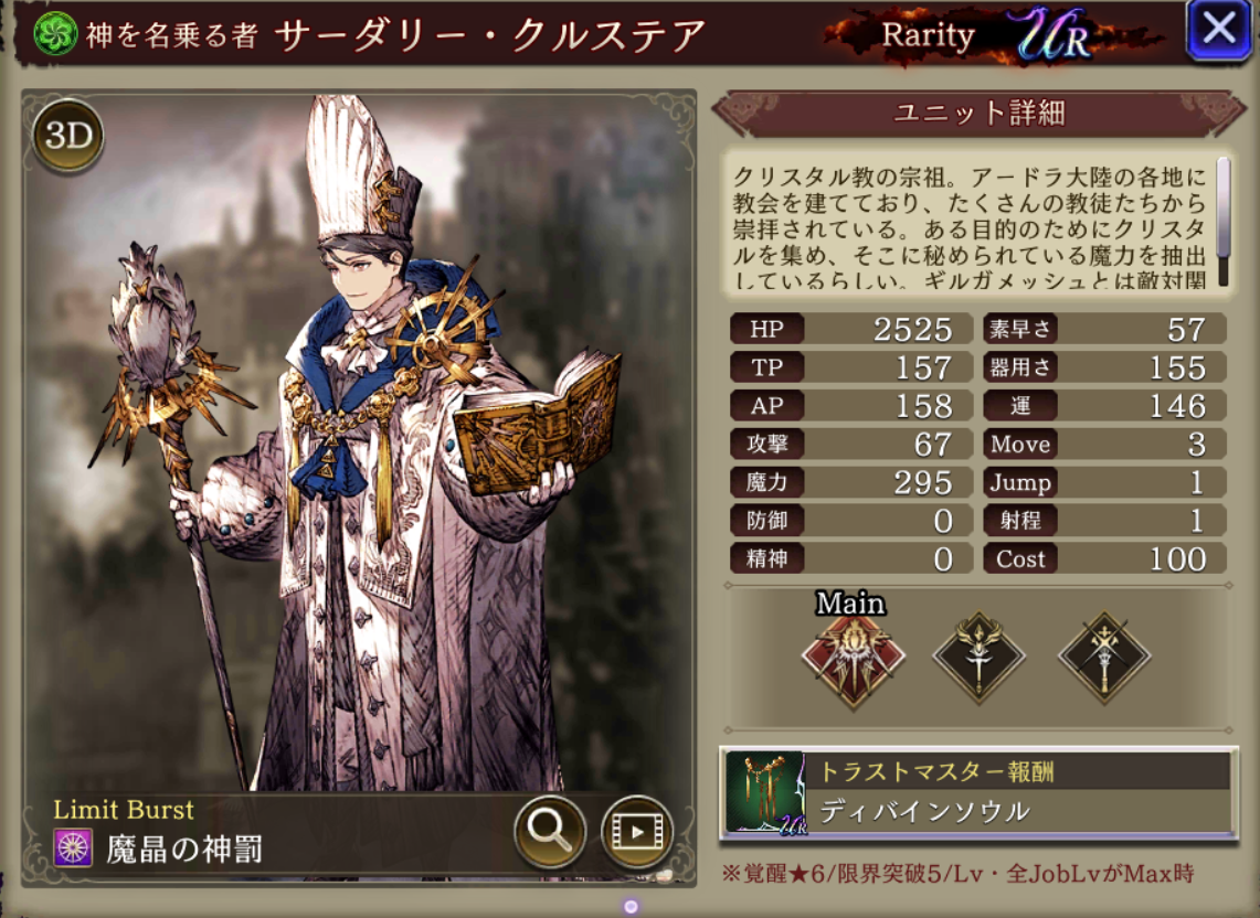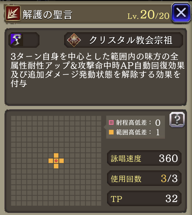 | MA3強化後⇩ 味方の風属性ユニットのHP上限+10%・風属性アビリティ攻撃+15 自身の範囲耐性+20、精神貫通率+30、HP上限+10%、攻撃アビリティ発動時間-20%、味方が戦闘不能時、自身のCT+30&3T魔法ダメージ上昇20% |
