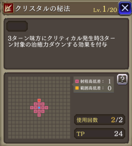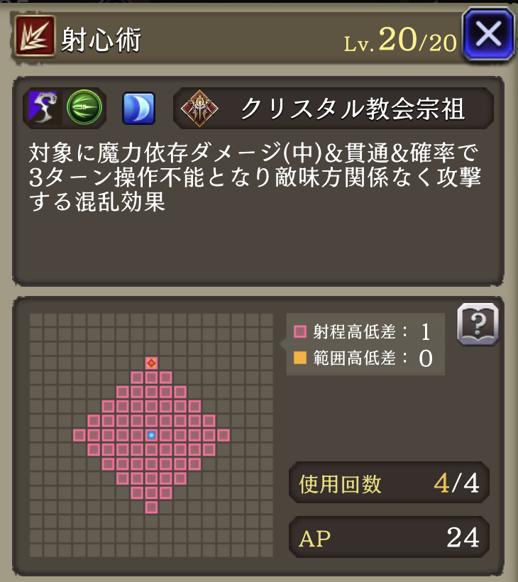 | JobLv22 射心術強化 | 射撃耐性25ダウン&混乱中なら獲得APダウン追加 |