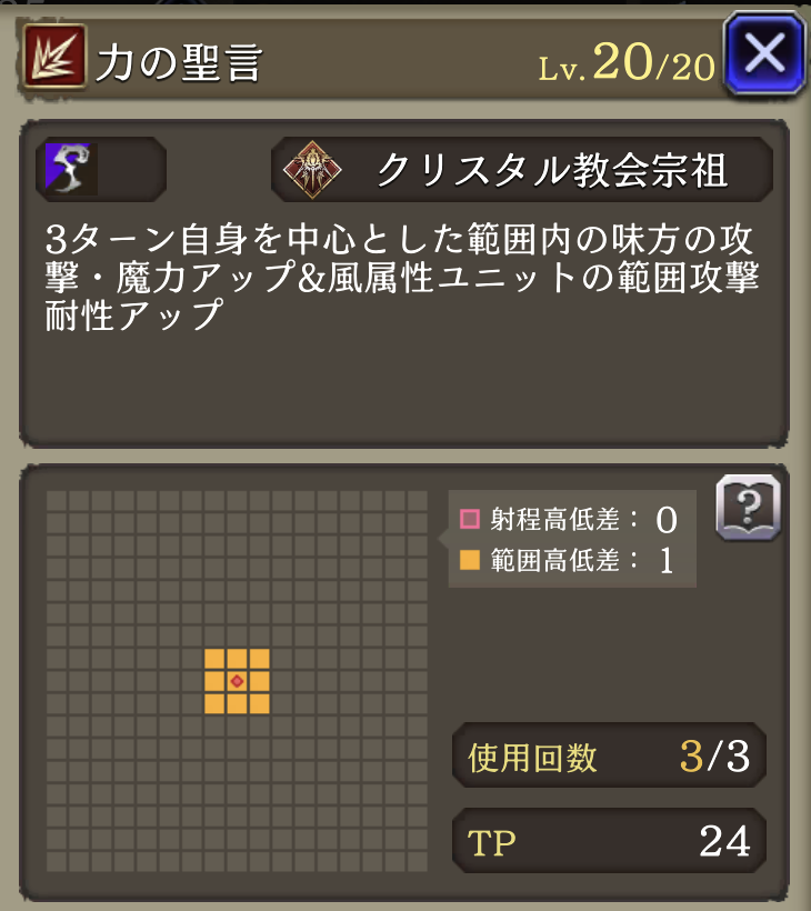 ![]() | 攻撃+40% 魔力+40% (風ユニット限定)範囲攻撃耐性+20 | 7 | |