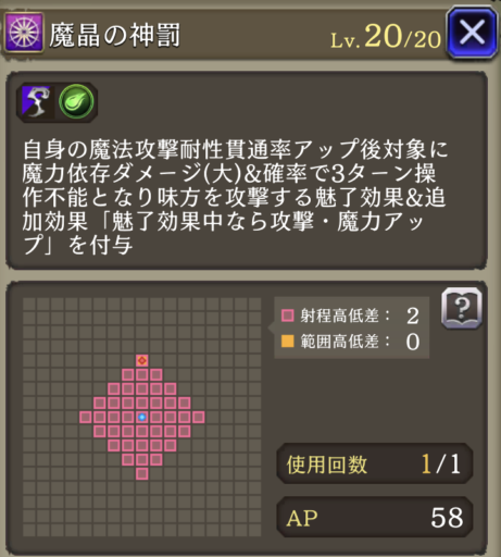 ![]() | 【EX】 自身の精神貫通率+50 全属性耐性+20 AP自動回復効果解除 追撃効果解除 | 8 | |
