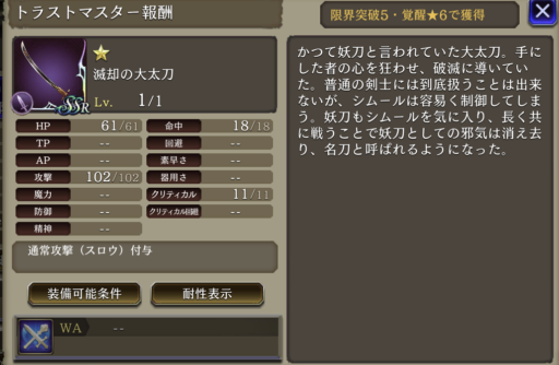 | 付加効果 | 防御貫通率+40 夢幻の極意の消費APダウン率UP |
