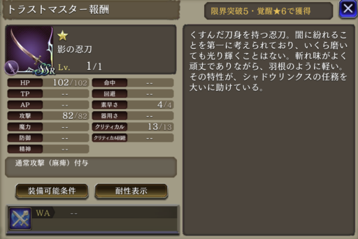 ![]() | 攻撃+42% クリティカル率+25 リアクション阻止率100 | 6 |