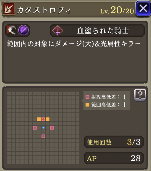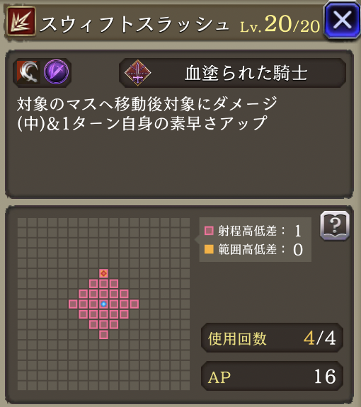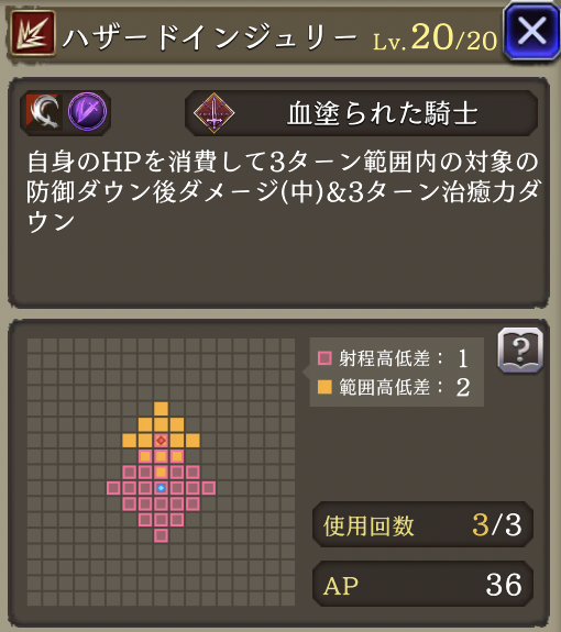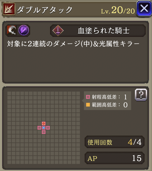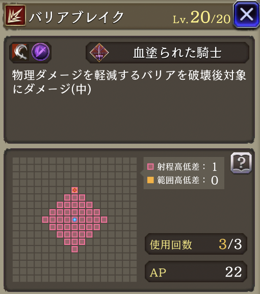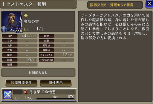 自身の防御貫通率+20、斬撃攻撃+10、HP上限+20%、斬撃貫通率+20、バトル開始時ダメージを完全に防ぐバリアを張る(4回)