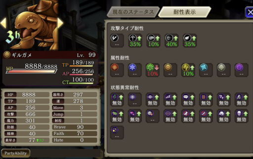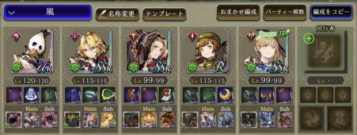 | 相手はほぼ土属性なので風パは相性が良いです。 素早さを盛るとギルガメの攻撃前に3体同時に殲滅可能です。 もしものドンムブ時はミーアの「エスナガ」で範囲回復。 ダリオ単独で囮作戦 |