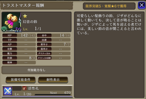 攻撃+60%、打撃攻撃+40、防御貫通+80、範囲回避率+50