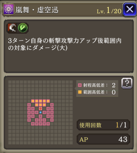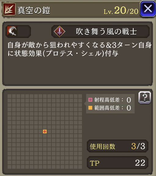 自身のヘイトアップ+5、HP上限+30%、攻撃+20%、追加効果(プロテス・シェル中なら斬撃耐性貫通率+40・物理被ダメ軽減+20%