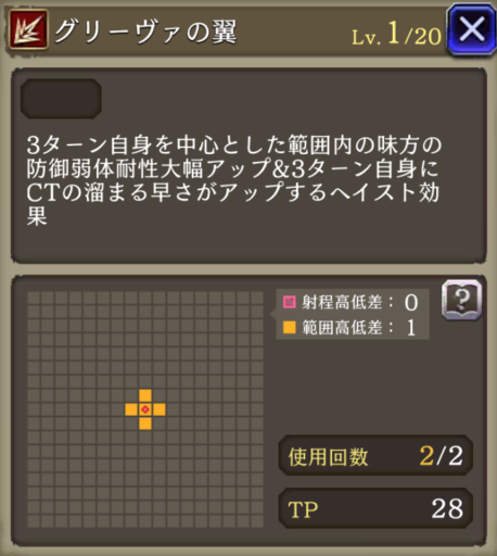 | 味方の雷属性ユニットのHP上限+10%・雷属性アビリティ攻撃+15、自身のリアクション阻止率+20、範囲耐性+10、斬撃攻撃耐性貫通率+10・範囲攻撃耐性貫通率+30・ハニカムバリアを強化、4ターン自身の斬撃攻撃・打撃攻撃耐性+&距離2以上1マス遠くなるほど被ダメージ軽減効果を付与(距離5マスまで効果増加) |