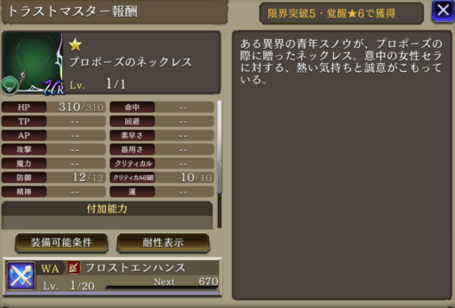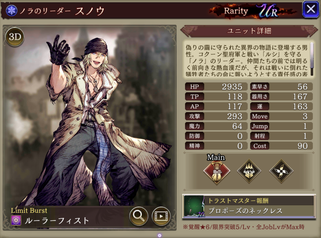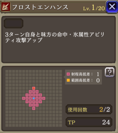 | 味方の氷属性ユニットのHP上限+10%・氷属性アビリティ攻撃+15、自身のHP+5%、ヘイト+5、治癒力+15、範囲攻撃耐性+10 |