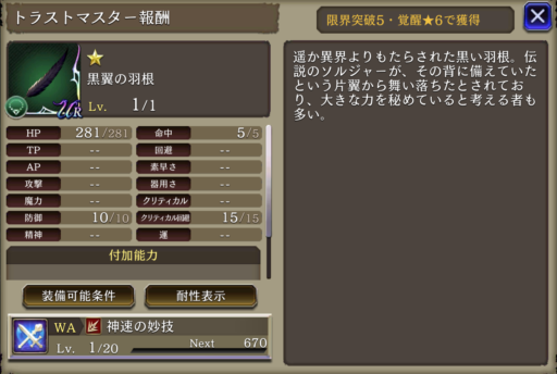 漆黒の片翼 | 素早さ+12%、永久レビテト Jump+1 |