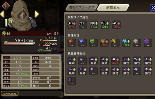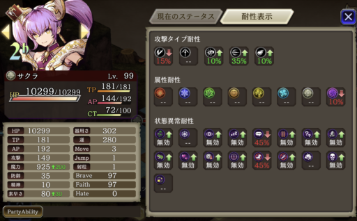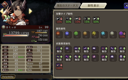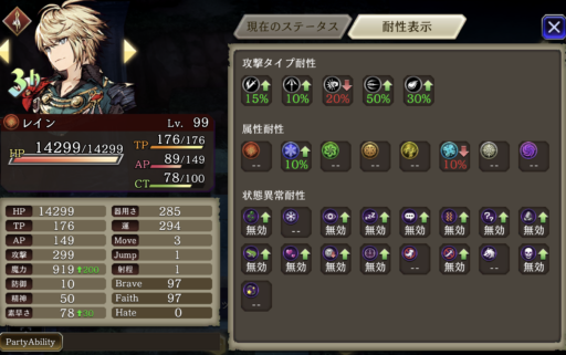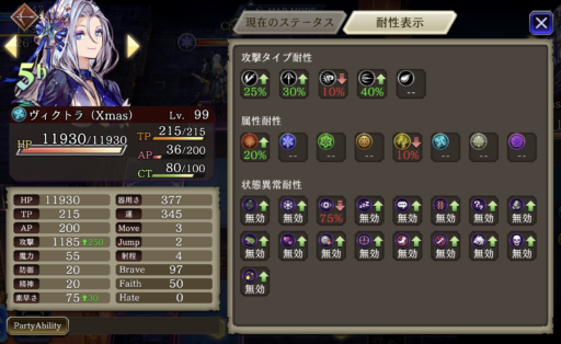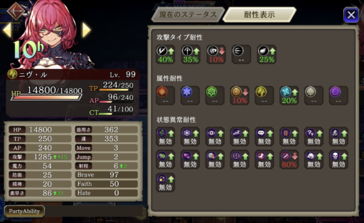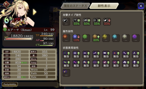 | (Lv50) | 射撃耐性+10 回避+10 ※ラメイガ限定 運+30% 闇属性アビリティ攻撃+15 AP消費率20ダウン |