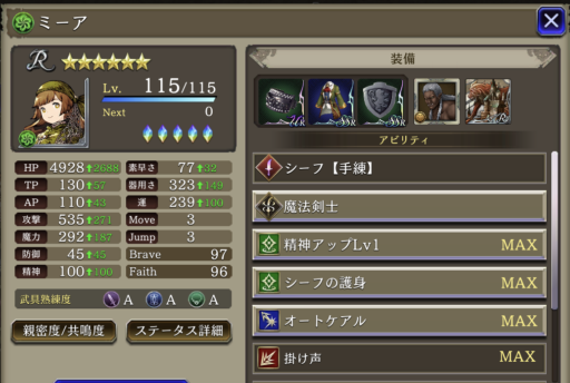 ミーアEX化をきっかけに安定して生存クリアできるようになりました。 (火力&耐久面UP 特に精神は装備で100に盛れてシヴァの被ダメを極限まで抑えられる&オートケアル持ち)⇩