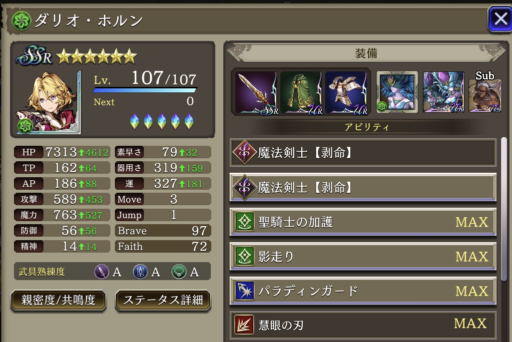 【編成】![]() タンク役のダリオとミーア 火力要員のガーガス(たまにダリオとミーア) サポートのヘレナとカディア ※物理アタッカーとしてロレイラかソシアが育っていれば 右3人の誰かと交換すると◎ VCで魔法火力や魔法耐久&AP獲得量+を重視 バフは極力使わず、安全が確保できていれば スキルを使わず通常攻撃で倒すように心がけます ![]() ▲タンク役のダリオステータス 信銘石が唯一付いています(外し忘れ) ![]() ▲火力要員ガーガスのステータス 活性孔でAP切れ予防 ![]() ▲タンク役ミーア EX化で防御面が大幅アップ VCリオニス城装備で精神100にもなります |