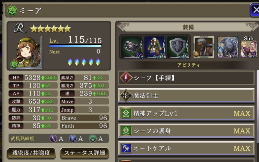 ミーアEX化をきっかけに安定して生存クリアできるようになりました。 (火力&耐久面UP 特に精神は装備で100に盛れてシヴァの被ダメを極限まで抑えられる&オートケアル持ち)⇩