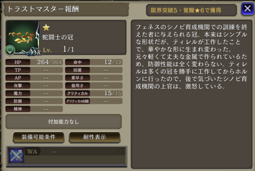 ![]() | 【EX】 治癒力+30 属性弱体耐性+100 HP上限+20% 防御貫通+40 | 9 | 17 |