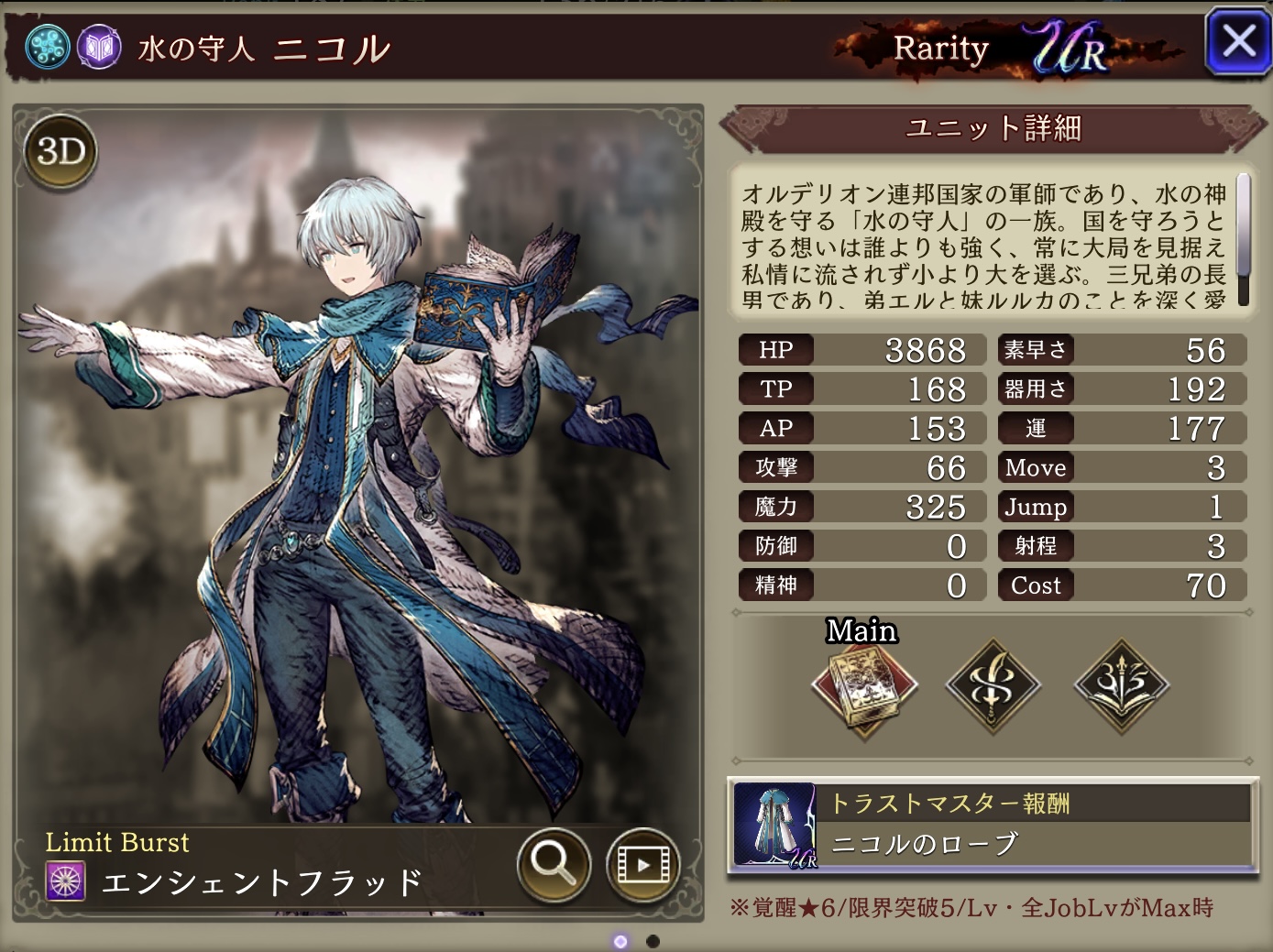 | ⇩MA2強化⇩ 味方の水属性ユニットのHP上限+10%・水属性アビリティ攻撃+15 自身の素早さ+5%・詠唱時間短縮200・火属性耐性+15・精神貫通+10・魔法被ダメ軽減10% |