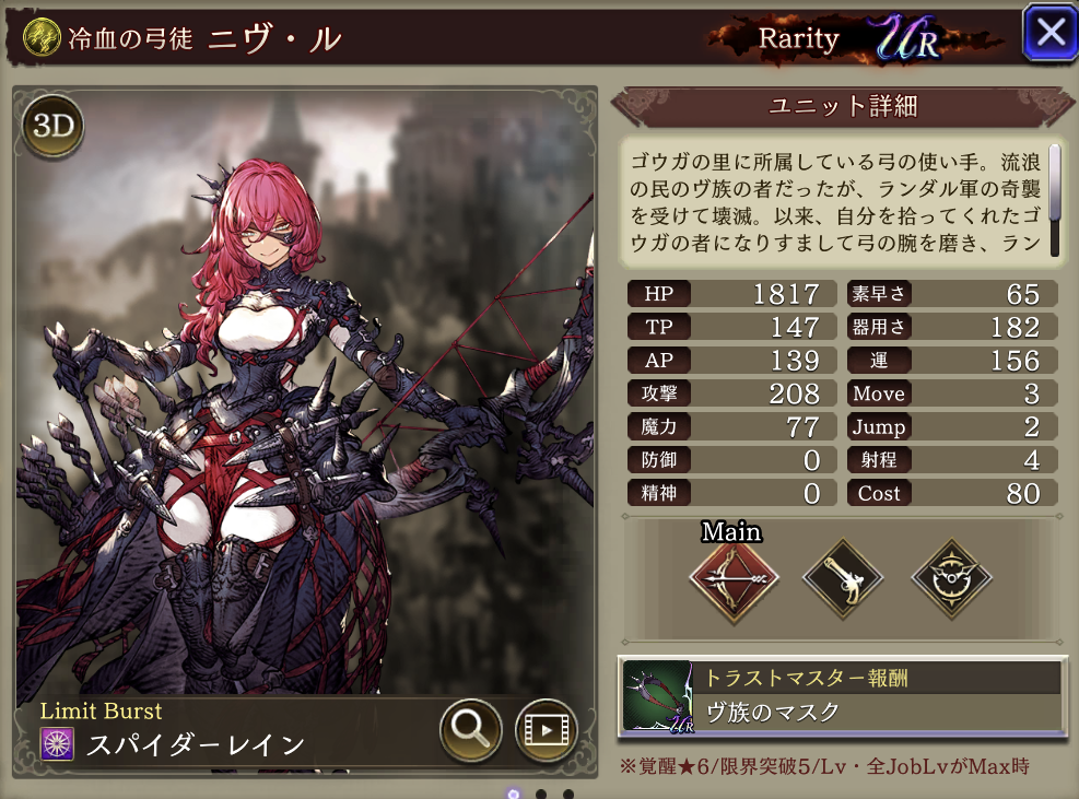 | 味方の雷属性ユニットのHP上限+10%・雷属性アビリティ攻撃+15、自身の防御貫通率+20、射撃攻撃力+5、攻撃+20%、射撃耐性貫通率+20 |