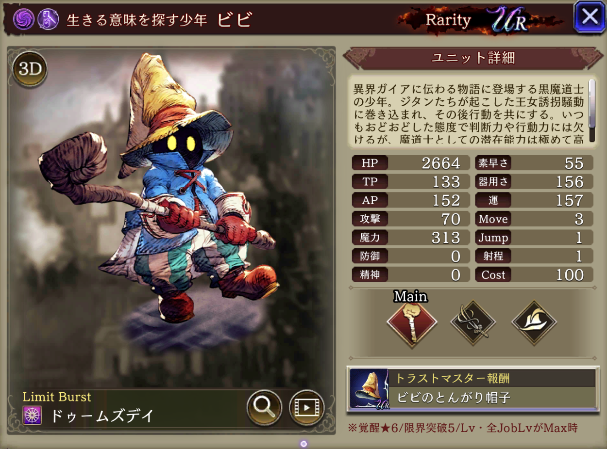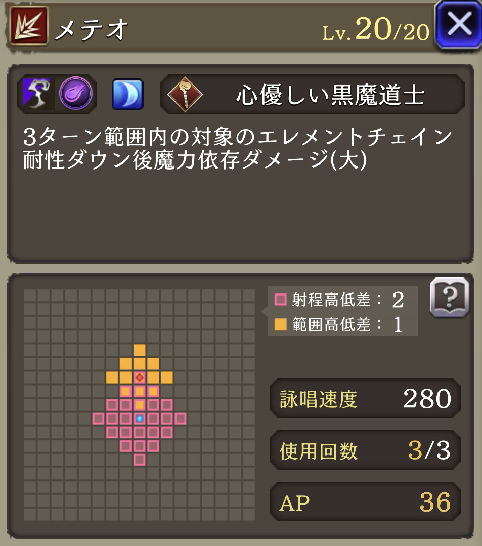 | ⇩MA2&3強化⇩ 味方の闇属性ユニットのHP上限+10%・闇属性アビリティ攻撃+15 自身の魔法攻撃耐性貫通率+20・範囲耐性貫通40・クリティカル回避+20・プロテス・リレイズ中なら命中+60 |