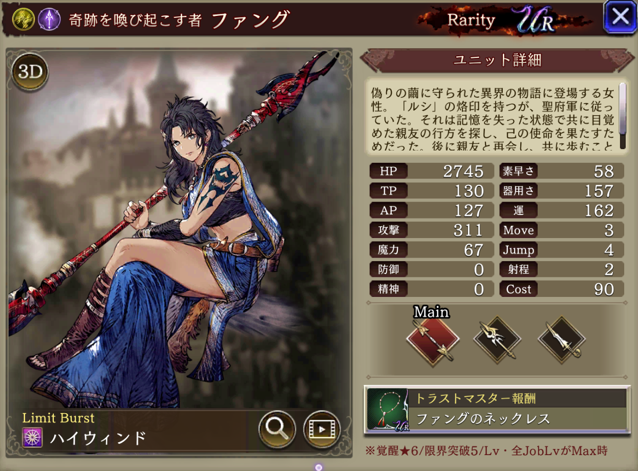 | 味方の雷属性ユニットのHP上限+10%・雷属性アビリティ攻撃+15、自身の刺突攻撃耐性貫通率+10、消費AP-15% |