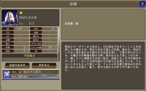 世界のために ↓ あの人のために | 魔力+24%、斬撃貫通+40、斬撃耐性+12、射撃耐性+12 ↓ 魔力+24%、被ダメ時更に+5%(最大15%)、斬撃貫通+40、単体貫通+40、斬撃耐性+12、射撃耐性+12 |