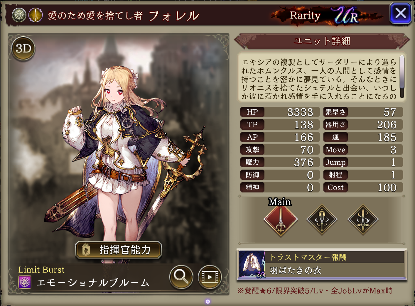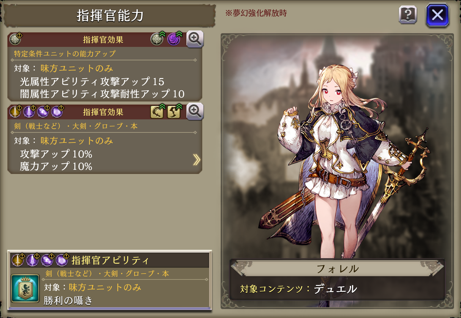 | ・味方の光属性ユニットのHP上限+10%・光属性アビリティ攻撃+15 ・自身の斬撃耐性貫通+20・単体耐性+10 |