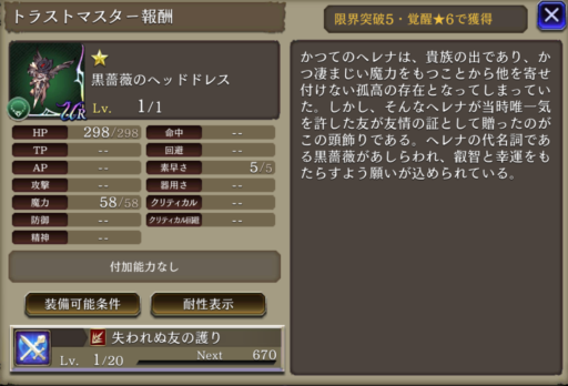 魔女の秘奥義(EX) ↓ 魔女の秘奥義(夢幻) | 魔力+60%、精神8ダウン、アビリティ発動時間短縮200 ↓ 魔力+60%、精神8ダウン、アビリティ発動時間短縮200、HP80%以上で範囲耐性+40 |