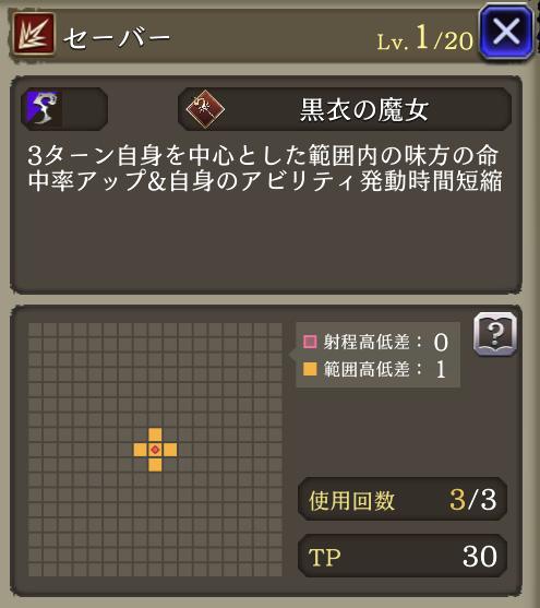 | アビリティ強化「セーバー」 効果時間3T→4Tに 自身の魔法攻撃+30、範囲攻撃耐性貫通率+30 物理被ダメージ25%軽減、HP吸収(50%)効果付与 |
