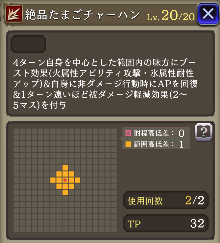 ![]() 4ターン自身を中心とした菱形範囲内にブースト(火アビ攻撃+35・氷耐性+20)&自身に非ダメージ行動時AP+10、1T遠い程被ダメ軽減(2~5マス) | 552 |